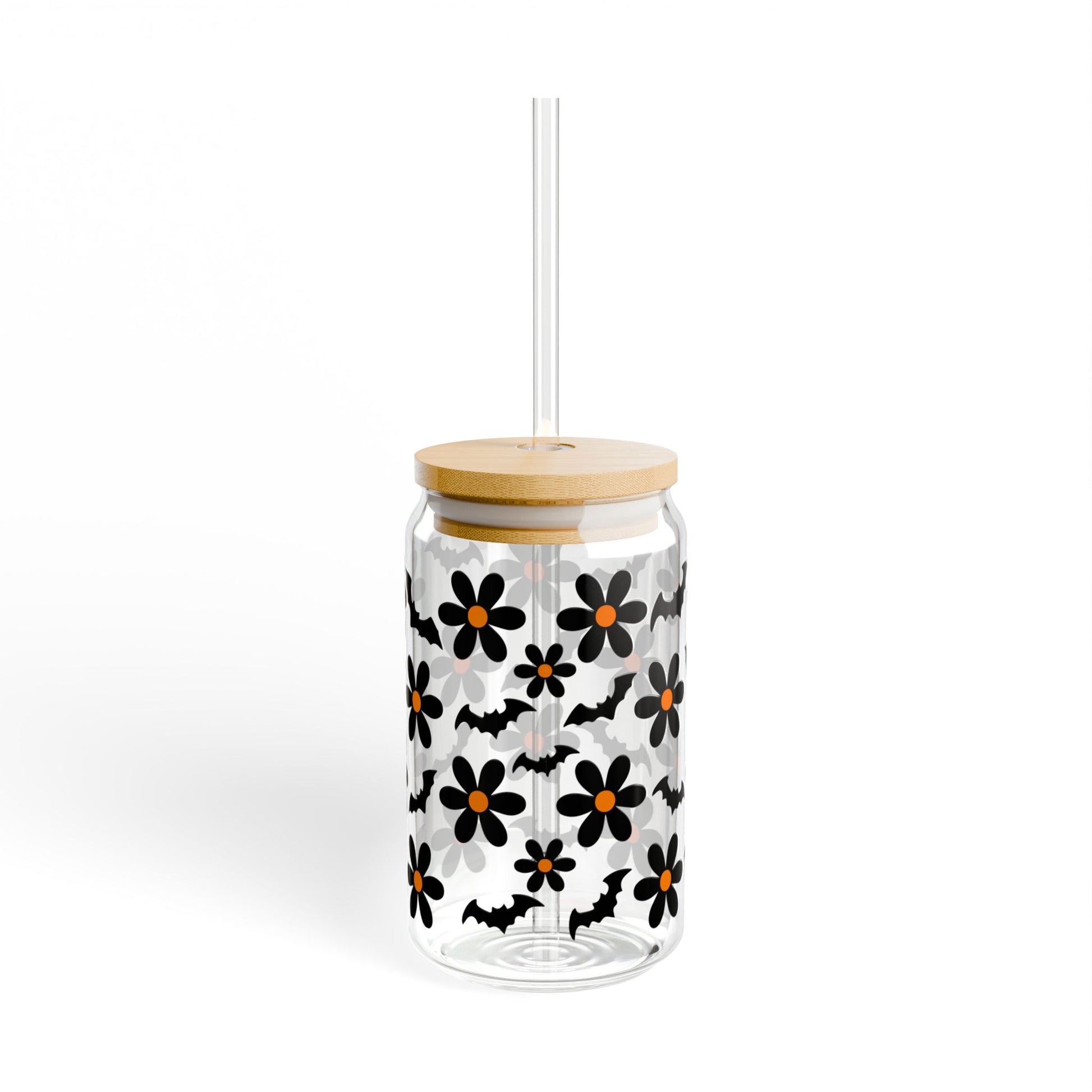 Halloween Bat Orange Black Flowers Sipper Glass, 16oz